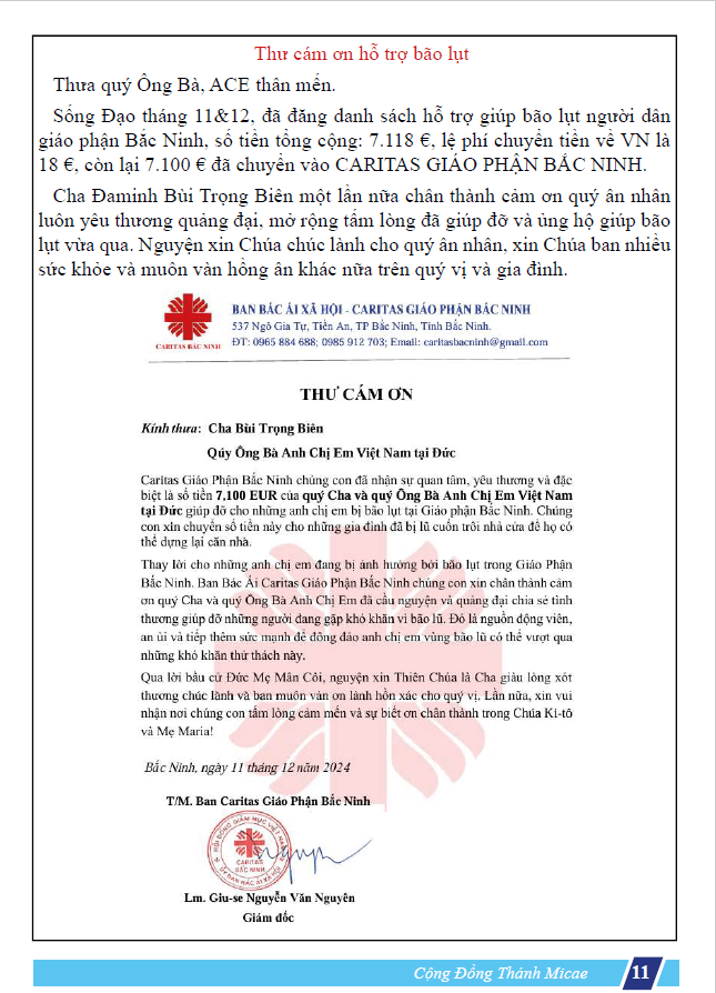 Toàn bộ số tiền quyên góp được từ cộng đoàn, cùng với số tiền từ quỹ của chúng ta, sẽ được dùng để hỗ trợ đồng bào bị thiệt hại do bão Yagi gây ra. Vào thứ Bảy, ngày 28.09.2024, nhân dịp lễ Bổn Mạng Cộng Đồng Thánh Micae, anh Nguyên sẽ đại diện cộng đoàn trao số tiền này cho Cha Biên dưới danh nghĩa chung của Cộng đoàn Mông Triệu. Trong tháng 10, Cha Biên sẽ chuyển toàn bộ số tiền quyên góp được về Tòa Giám Mục Bắc Ninh để Đức Giám Mục sử dụng giúp đỡ người dân nghèo đang gặp khó khăn do lũ lụt.