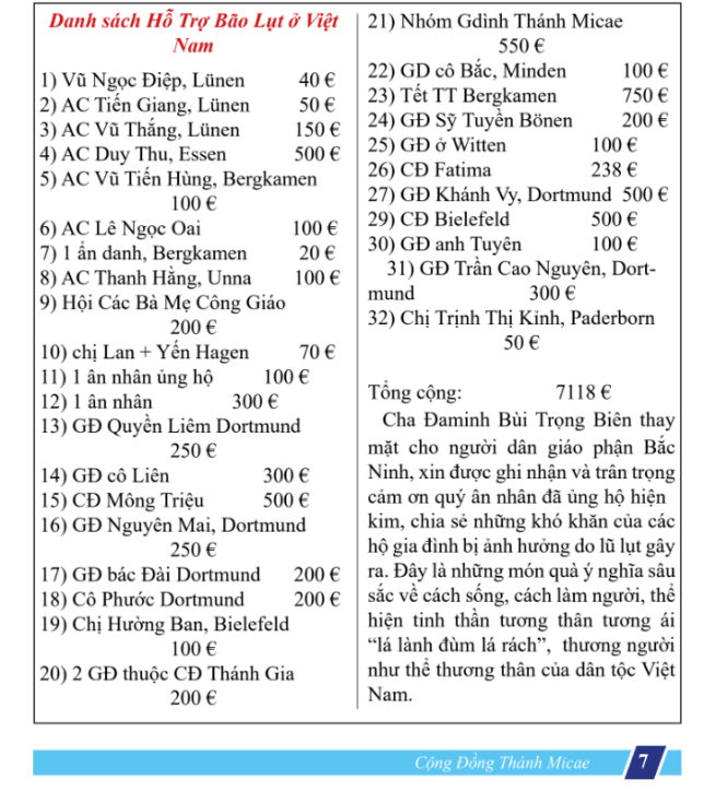 - Gia đình anh chị Quyền Liêm ủng hộ số tiền 250 EUR.