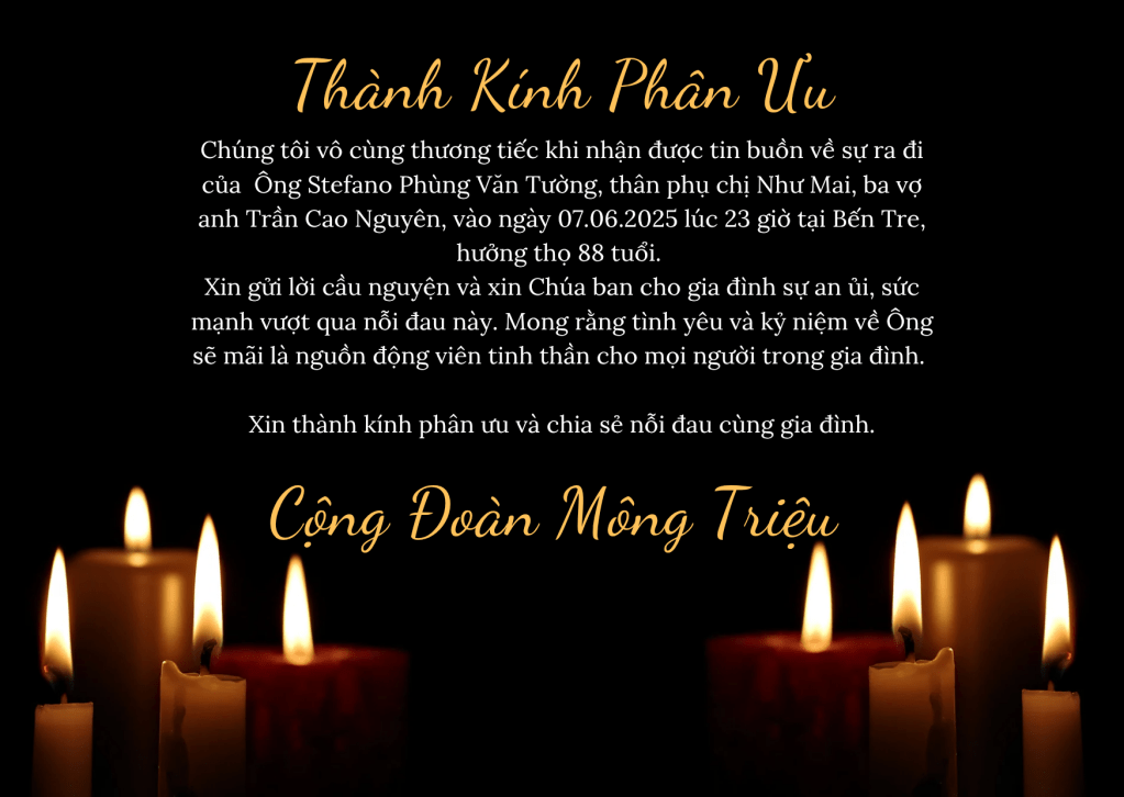 Chúng tôi vô cùng thương tiếc khi nhận được tin buồn về sự ra đi của Ông Stefano Phùng Văn Tường, thân phụ chị Như Mai, ba vợ anh Trần Cao Nguyên, vào ngày 07.06.2025 lúc 23 giờ tại Bến Tre, hưởng thọ 88 tuổi.