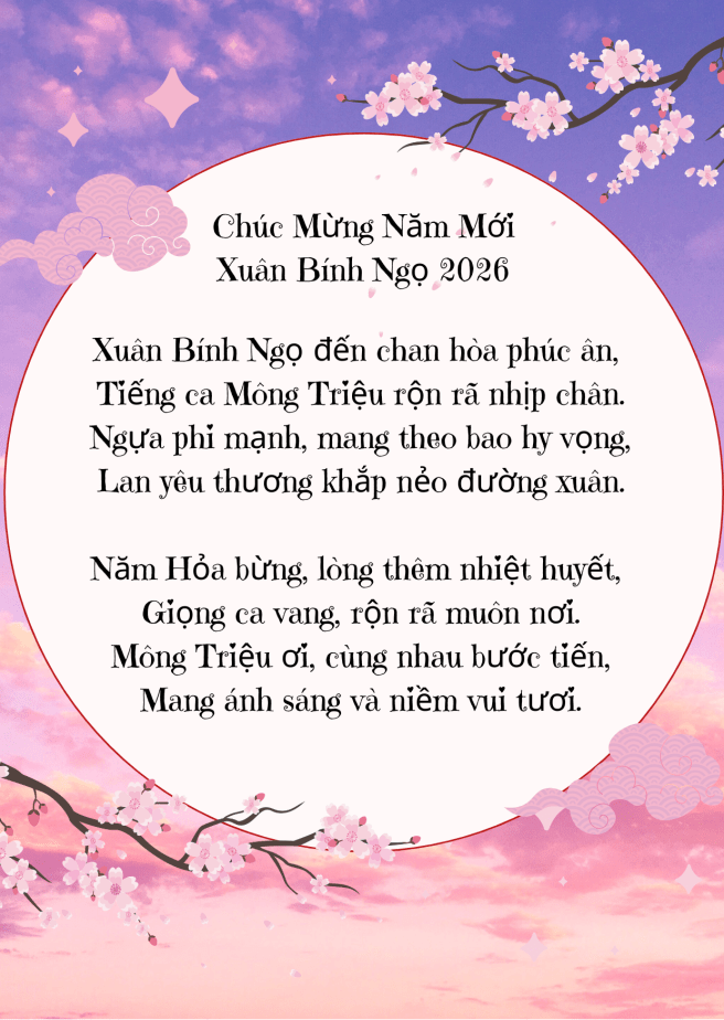 Chúc Mừng Xuân Bính Ngọ 2026 Tháng Hai 5, 2026Tháng Hai 6, 2026 ~ cdmongtrieu Chúc mừng Xuân Bính Ngọ Cộng Đoàn Mông Triệu Chúc mừng Xuân Bính Ngọ Ca Đoàn Mông Triệu Ähnliche Beiträge Đăng bởi cdmongtrieu Xem tất cả bài viết bởi cdmongtrieu